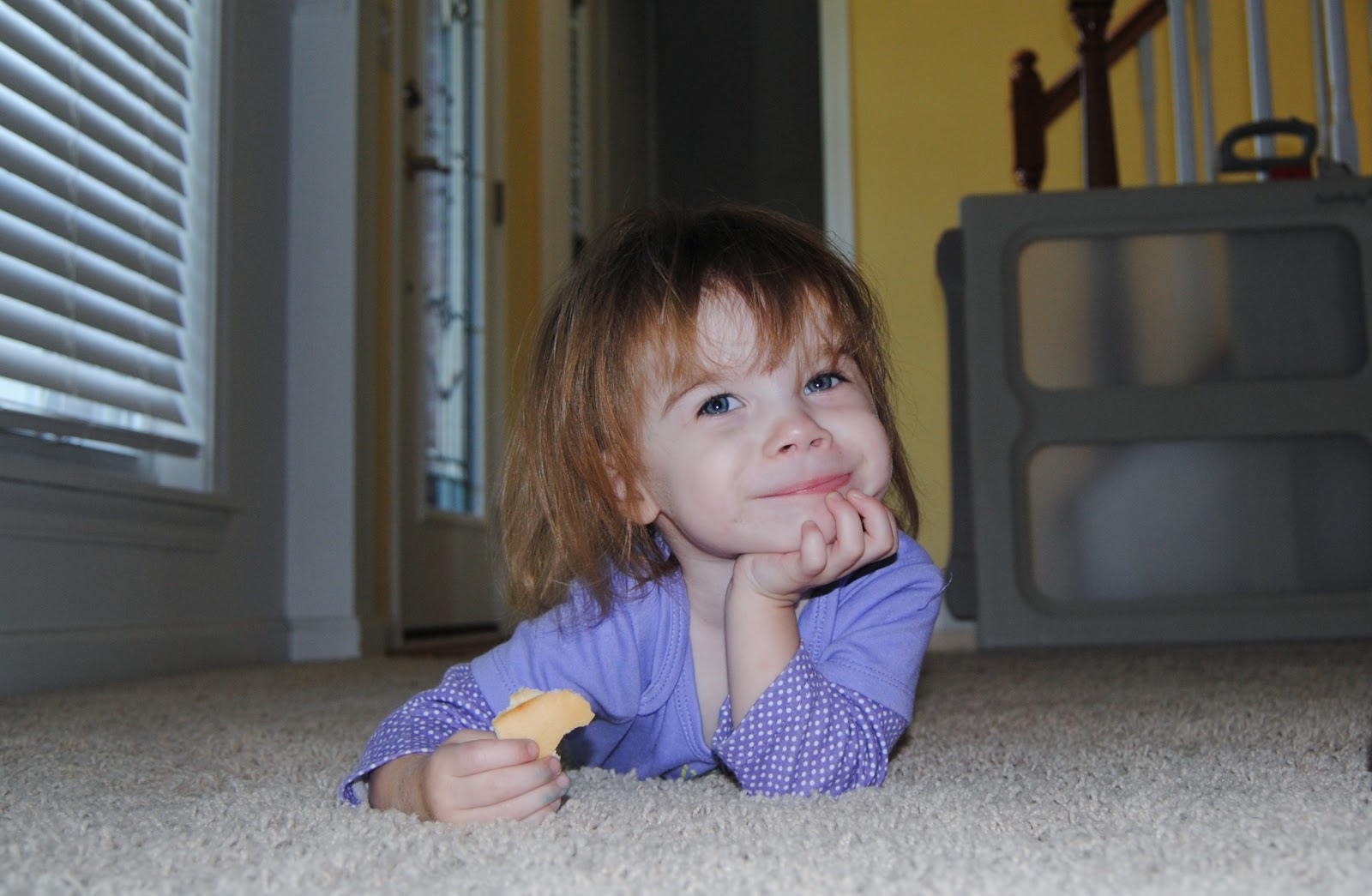 I caught Sophie on the floor like this, staring up at when I used to keep her birthday presents. She was fondly repeating, "Elmo-Abby", because a few of the gifts had wrapping paper with Elmo and Abby on them. |