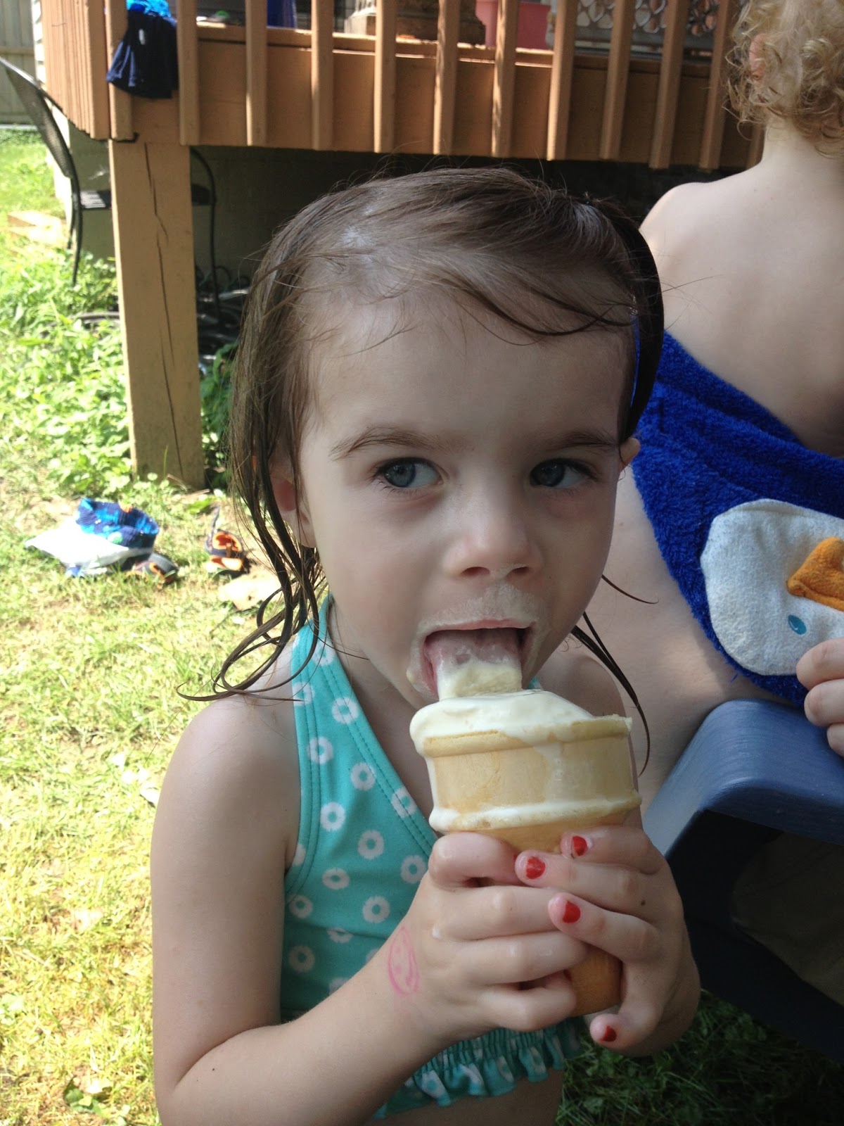 | We went to our church festival a few weekends ago. We stood over by a live band to listen to the music (and because it was right next to the pull tabs). Josie stared down the band like this the whole time. I'm not sure if she was annoyed, intrigued, or bored. |